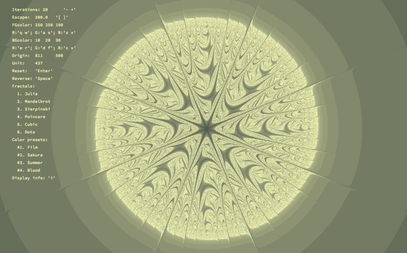 This was one of the first projects in the curriculum. The goal is to render various fractals in in real-time by taking mouse position as parameter. Parallel threads are used to speed up the rendering.
