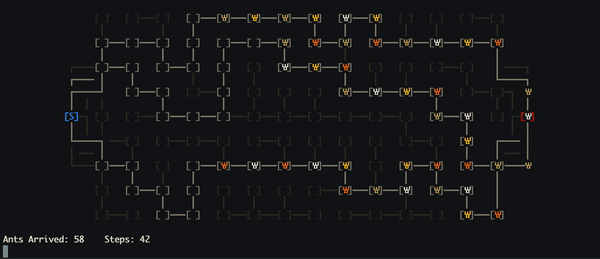 This is an optimal transportation puzzle where one needs to find the minimal number of steps to transport a fixed amount of ants from one point to another through a graph. I had fun designing a retro-style ascii visualizer on top of the algorithm =)