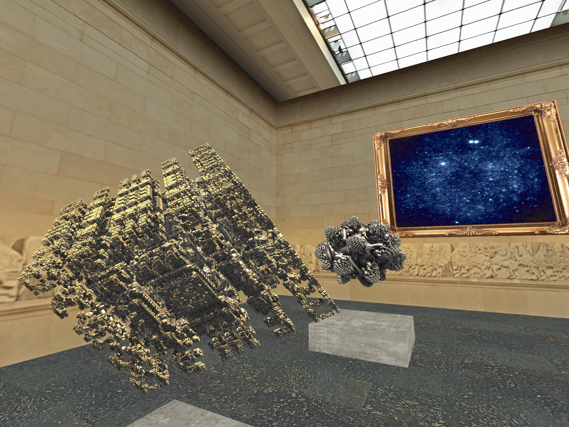 A cool graphics project exploring the fantastic world of openGL fragment shaders (i.e. using a single shader applied to a quad to render things line 3 dimensional fractals). We place shaders in a museum environment (Which I definitely did not steal from the British Museum Elgin marble room) by using billboards to fake 3D and switch between two different display/perspective systems when far away and close to the shaders.