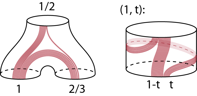 So, the last diagram isn’t meant to actually having the number of curves added up; as we were sating, the weight can be any positive real number, not only rational numbers; what I meant here is that, given any triple of positive real numbers (e.g. 1, 1/2, 2/3) there is a way to assign weights to the branches where they match all 3 on the cuffs. In this example, the thin branch on the right would carry a weight of 1/12, so that we have (1/2-1/12)+(2/3-1/12)=1. Agree that to be actually accurate I should have put 12 lines in the left cuff, 6 in top and 8 in the right.